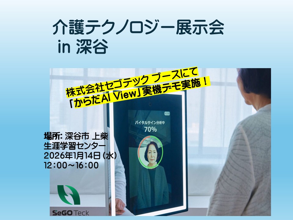 深谷市でデモ実施します。1月14日 2026.01.13 ALL 埼玉県深谷市で介護福祉勉強会&展示会が明日開催。セゴテックでは「からだAIView」を実機体験して頂くデモを実施します。 Xでシェア Facebookでシェア URLをコピー